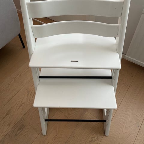 Stokke tripp trapp tuoli sävyssä white wash ja valkoinen vauvasetti. Mukana myös valjaat, istuinpehmuste ja luistonestopalat.