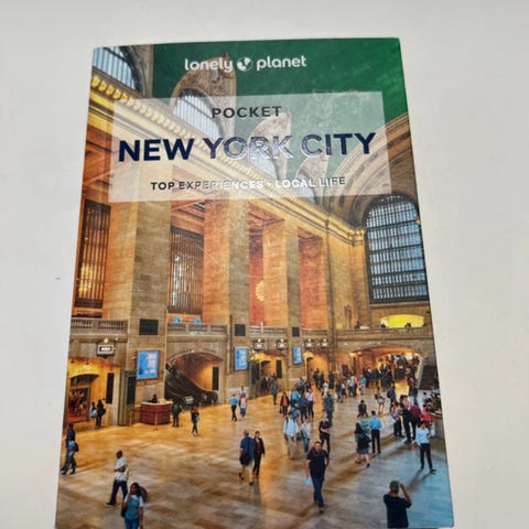 Lonely Planetin New York City vuodelta 2024. Muutama sivu käännetty hiirenkorvalle j kaarta irrotettu takakannesta.