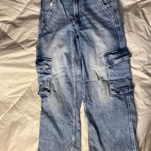 H&M ohuet denimfarkut tytöille, koko 140, sininen väri. Polvissa yksisarvisompeleet, jotka pysyvät.