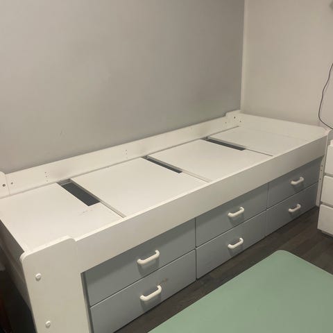 Paketissa oleva (päädyt avattu), käyttämätön Unipuun lyhyt turvalaita. Lyhyt turvalaita sopii Unipuu-malliston pikkuparveen, kerrossänkyyn ja parvisänkyyn.