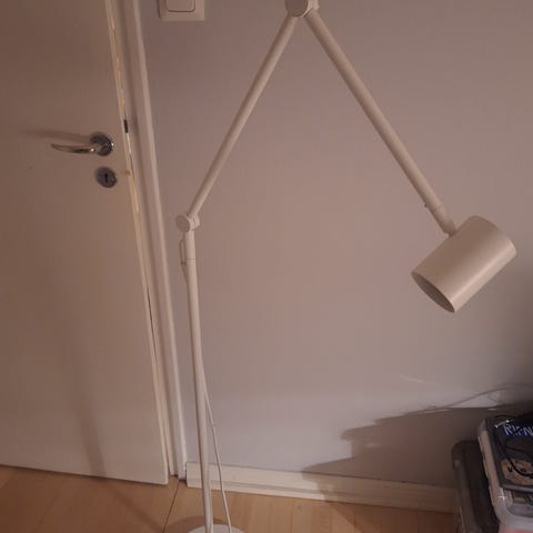 IKEA lattiavalaisin, jossa valkoinen rei’itetty varjostin metallisella sisäpinnalla mikä heijastaa valoa kauniisti. Nymö sarjan vanhempaa tuotantoa. Valaisin on varustettu mustalla metallisella jalustalla.