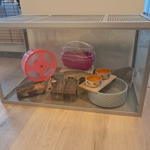Myydään tyttären puolesta terraario esim hamsterille tai hiirille. Terraario on hankittu meille käytettynä, mutta koskaan ei tullut käyttöön. Mukaan tulee uutta vastaava Trixie Hypno juoksupyörä. Terraarion päällä on itsetehty plexinen kansi jossa ilmareijät. Terraarion mitat: 75cm x 34cm x 38,5cm (l,s,k).