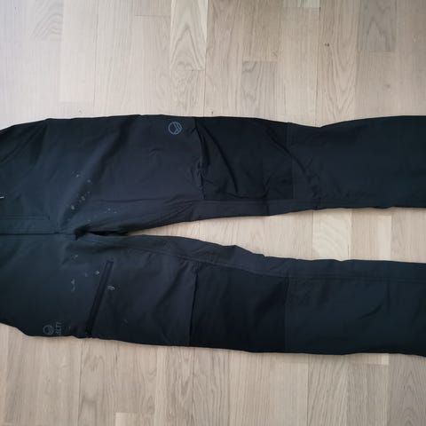Tekniset ja hengittävät housut, joissa joustava vyötärö ja kiristysnauhat.