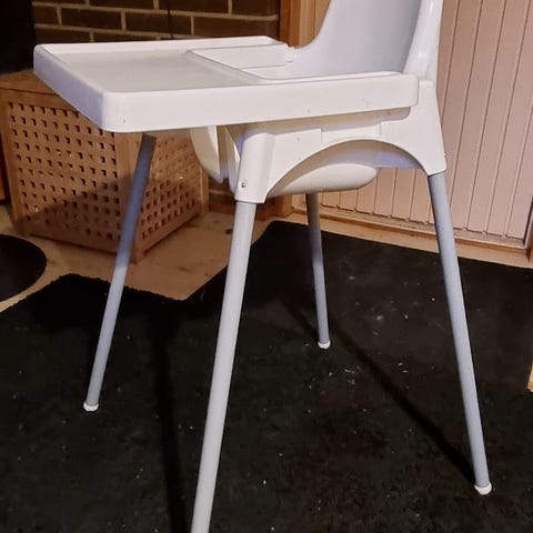 IKEA Antilop -lastensyöttötuoli, mukana jalkatuki sekä kaksi vaihdettavaa pehmeää tukityynyä ja päällistä.