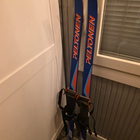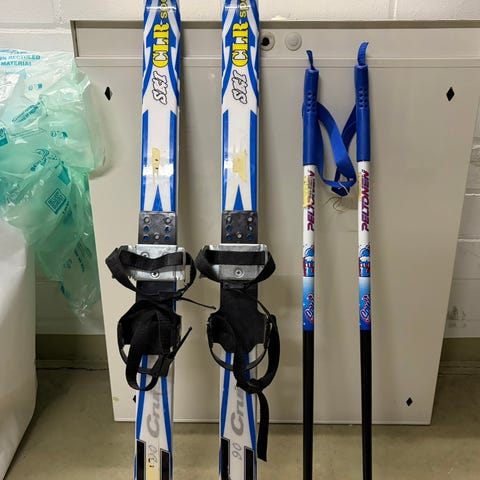 Hyväkuntoiset ja vähän käytetyt lasten ensisukset ja sauvat. Suksien pituus 90 cm ja sauvojen pituus 70 cm.