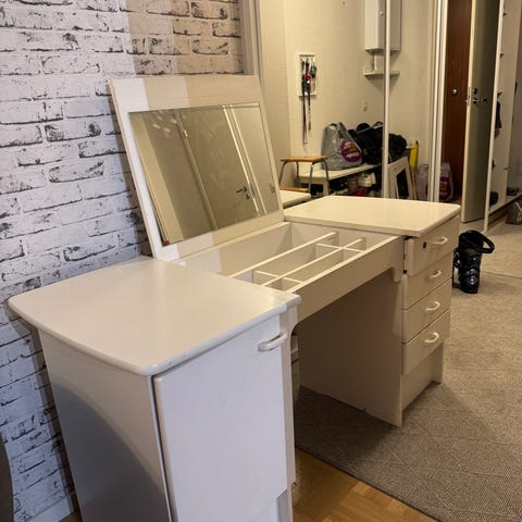 Valkoinen koulupöytä/peilipöytä, siisti niin ulkoa kuin sisältäkin, toisen laatikon saa lukkoon.