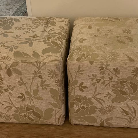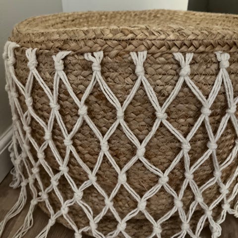 Myydään hyväkuntoinen rahi. Päällinen makramekudetta, jalat puuta. Siistissä ja hyvässä kunnossa.