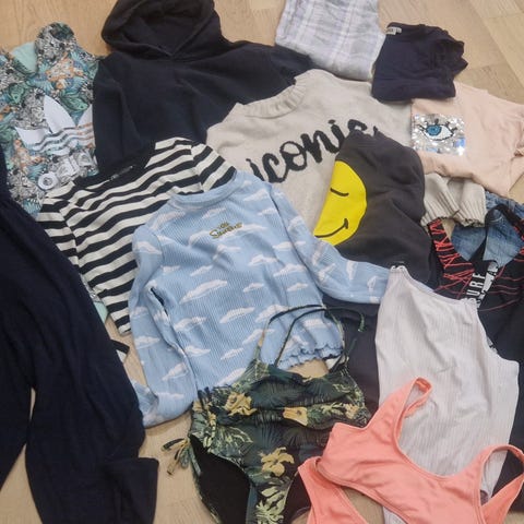 Tytön 140-150 cm vaatepaketti: Valkoiset kulutetut farkut 140 cm, tummanharmaa hapsuneule 152 cm, luonnonvalkoinen college S, keltainen college 146-152 cm, lohenpunainen huppari 134-140 cm isoa kokoa, vaaleanpunainen printtihuppari 146-152 cm. Harmaa trikoopusero leveää ribbiä 140 cm. (Vaatteet eri merkkejä, mm. H&M ja Gina Tricot)