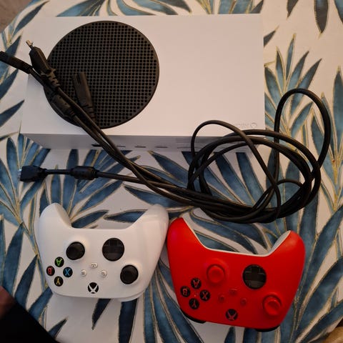 Xbox Series S (Ei levyasemaa) + kaksi ohjainta. Mukana myös virta- ja HDMI-kaapeli.