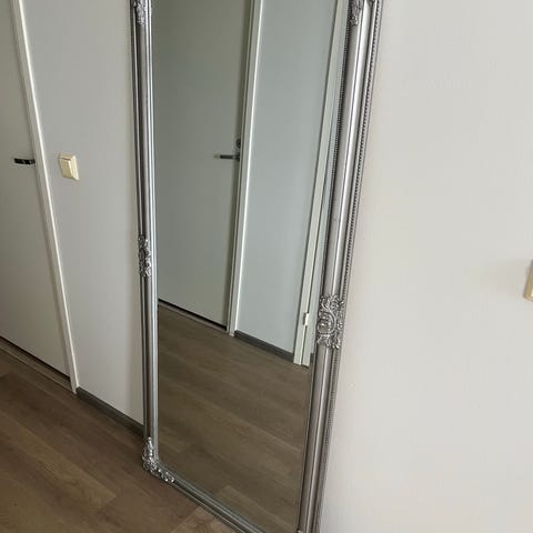 Jysk peili valkoisella kehyksellä ja kultaisilla yksityiskohdilla. 70x90cm.