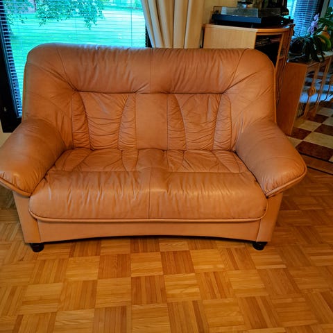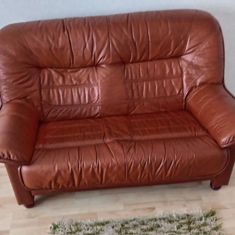 Tästä kahden istuttava aito nahkasohva. Ollut käytössä useamman vuoden, mutta edelleen hyvässä kunnossa. Istuintyynyt kiinteät, ei irroitettavissa.