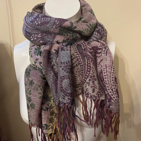 Tumman lilalla pohjalla viininpunaisia ja harmahtavia kuvioita.