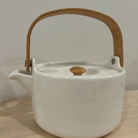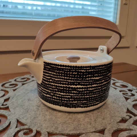 Marimekko Sääpäiväkirja-teekannu, jossa on bambukahva ja irrotettava suodatinosa. Sopii teen valmistukseen ja tarjoiluun.