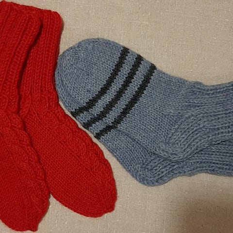 Novita Nalle langasta ja Seitsemän veljestä langasta kudottuja villasukkia. Yhden parin hinta 2,50.