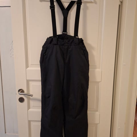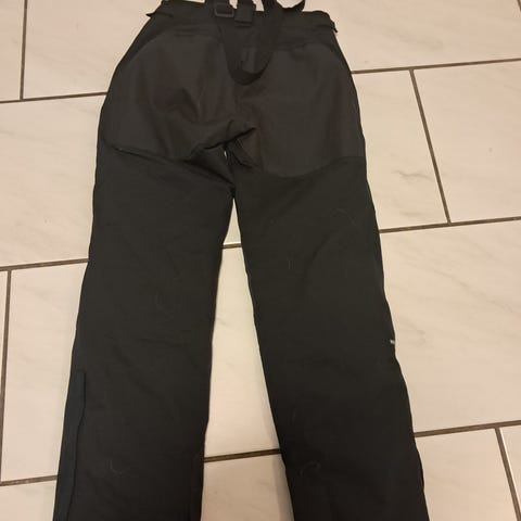 Vyötäröllä säätömahdollisuus tarroilla. Napit ja vetoketju edessä. Lahkeissa lumilukot. Nämä ovat malliltaan hyvät housut ja toimivat talviulkoiluun. Nyt viimeisen käytön jälkeen ei ole pesty, jonka vuoksi lahkeiden sisäsivulla vähän likaa (kts. kuva). Tämä lähtenee pesussa pois. Ryppyiset säilytyksen jäljiltä. Henkseleitä näissä ei ole.