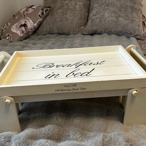 Myydään ihana, valkoinen, aamiaistarjotin jaloilla.