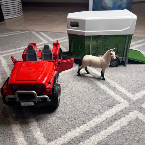 Lasten lelusarja, joka sisältää punaisen maastoauton ja hevoskuljetusvaunun.