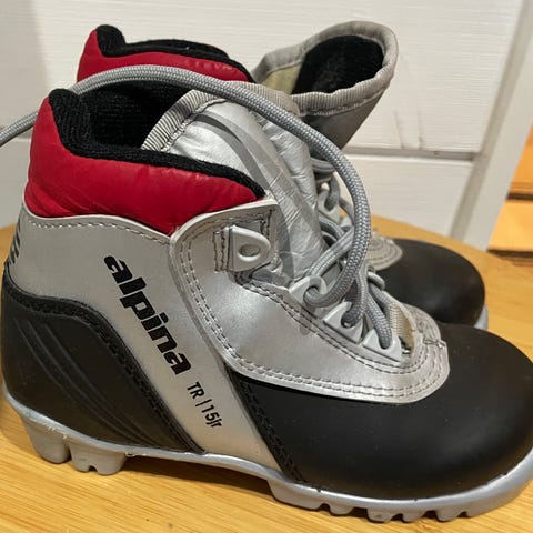Alpina lasten hiihtomonot, koko 32. Väri musta ja harmaa, nauhallinen kiinnitys. Sopii NNN-siteisiin.