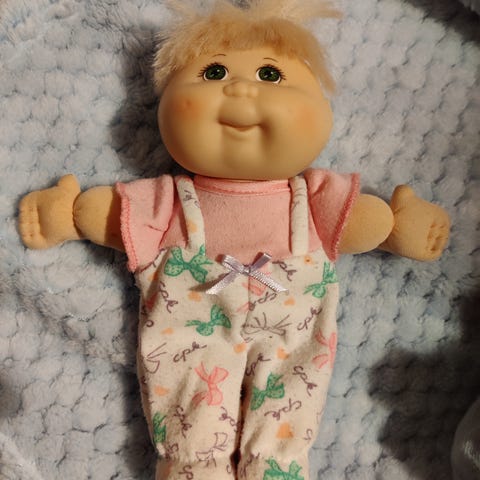 Vuodelta 1984 aito Kaalimaan Kakara. Housujen vyötäröstä kuminauha löystynyt.