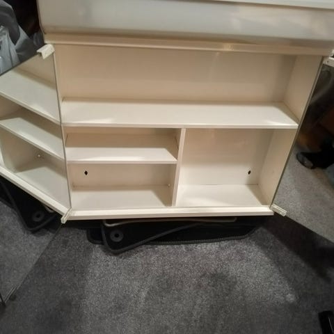 Valkoinen peilikaappi, vessaan tai kylppäriin. Kaapissa on peiliovet ja säilytystilaa kylpyhuonetarvikkeille.