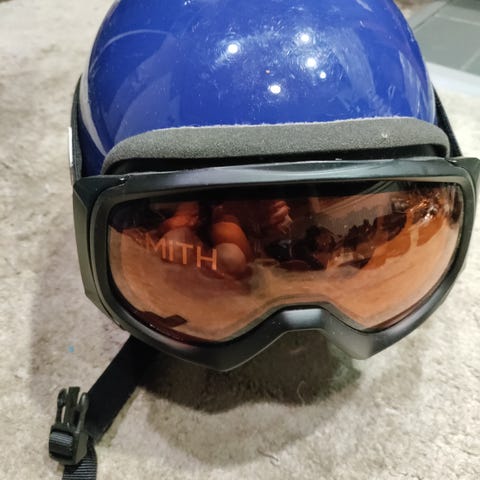 Erittäin vähän käytetty kypärä ja lasit; kunto erinomainen.