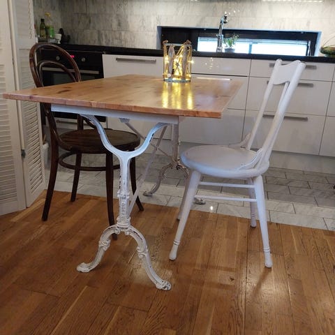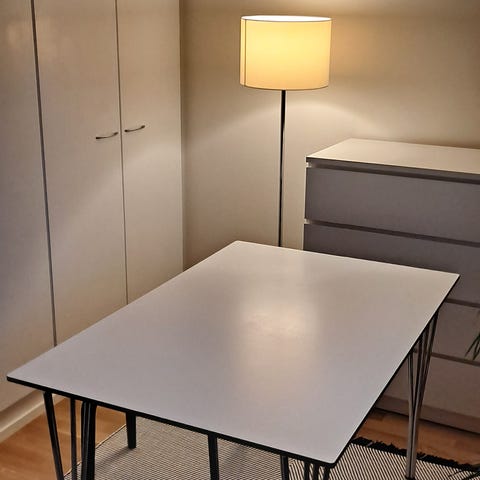 Upea uudenveroinen Tanskalainen pieneen tilaan sopiva siro ja erittäin tukeva Ruokapöytä / Työpöytä, joka varastoituu pieneen tilaan kun jalat taittuvat (helppokäyttöinen mekanismi - katso toiseksi viimeinen kuva), alla pienet pyörät - helppo liikutella (katso viimeinen kuva).