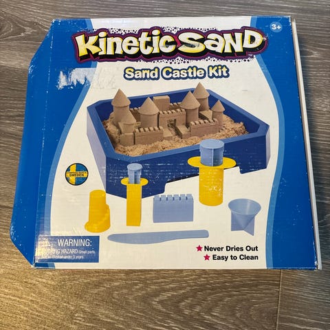 Kinetic Sand Sandcastle Set lasten hiekkaleikkisetti, sisältää sinistä muovailuhiekkaa ja hiekkaleluja, kuten lapio, harava ja muotit. Sopii hiekkalinnan rakentamiseen ja muovaamiseen.