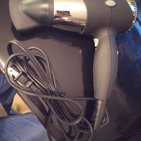 Braunin hiustenkuivaaja. Kaksi voimakkuutta puhallukseen, ei lämmönsäätömahdollisuutta. Mukaan kapeampi suutin. Käytönjälkiä pinnassa, mutta toimiva.