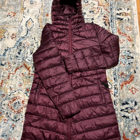Halti naisten kevytuntuvatakki, koko 38, Väri violetti, oikea sävy näkyy ulkokuvissa. Takissa on vetoketjukiinnitys ja huppu. Päälimateriaali ja vuori polyamidi, täyte 90% untuva ja 10% höyhen. Kunto on erittäin hyvä.