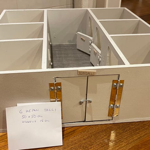 Itse tehty koivuvanerinen talli esim Schleich hevosille. Paikka 9 hevoselle ja erillinen pesupaikka. Saranoidut ovet ja karsinoissa verkkoikkuna ovissa. Laadukkaasti tehty.
