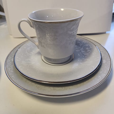 Myydään tarpeettomaksi jäänyt posliiniastiasto. Lautasten koot kuvissa. Kuppeja on 22kpl, pikkulautasia 17kpl ja isoja lautasia 18kpl. Merkki tuntematon ja suurimmaksi osaksi siistit ja ehjät. Parissa kultareunus hieman lohkeillut / käytön jälkeä.