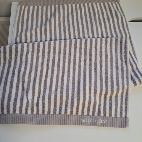 Vähän käytetty Marimekon musta- harmahtava raidallinen pyyhe.