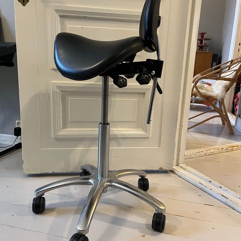 Satulatuoli korkeuden ja selkänojan säädöllä. Istuimen asentoa voi myös säätää. Kunto hyvä, ei moitteita.