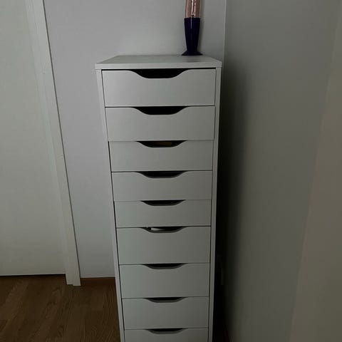 Jyskin 4 laatikon Limfjorden lipasto. Hyvässä käytetyssä kunnossa, pari tussijälkeä laatikon pohjassa. Liukukiskot kaikissa laatikoissa, laatikot saa helposti irti. Ruuvit ja takalevyt pitänee kiristää noudon jälkeen.