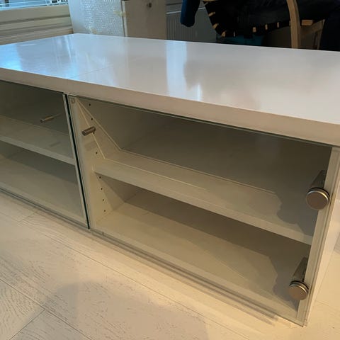 Muuramen TV -tasoon sopivat media kalusteet. Lasihylly molemmissa. Ovessa kova pleksi, eli ei lasia. Ihan pieni naarmu toisessa ovessa. Koko tiedot yhden yksikön. Hinta sisältää molemmat vitriinit.