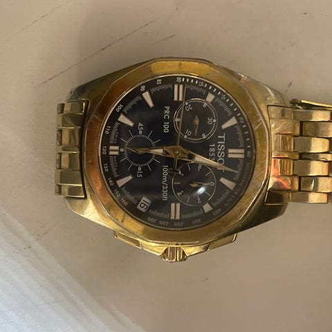 Tissot miesten rannekello, jossa on metalliranneke ja monitoiminen kellotaulu. Kello sisältää ajanoton ja päivämäärän näyttöominaisuudet.