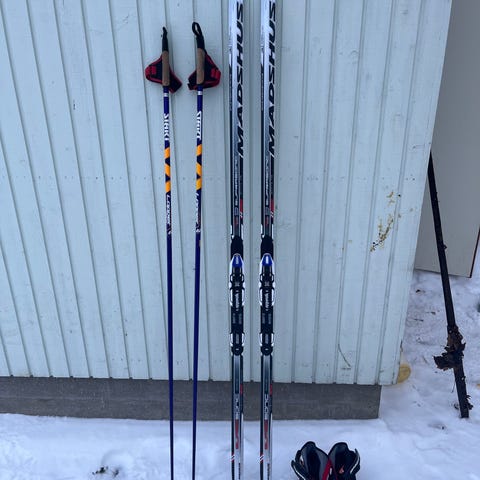 Sukset, sauvat ja monot luisteluhiihtoon. Suksien pituus 187cm, sauvojen pituus 162cm ja monojen koko 43 1/3.