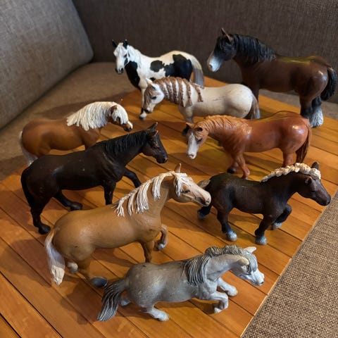 Enemmän ja vähemmän leikityt hevoset myynnissä pakettina.