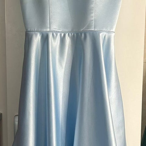 Vaaleansininen tyttöjen satiininen juhlamekko. Koko XS/34. Vain nouto.