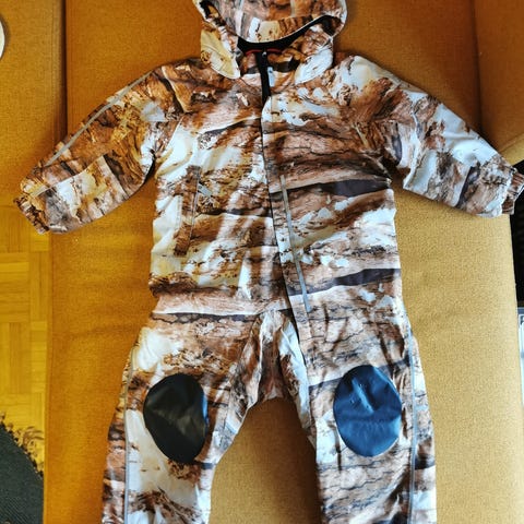 Oranssi Reiman toppahaalari. Koko 86. Joustava käyttää ja istuu kivasti: on ohut, mutta lämmin. Villahaalarin kanssa meni kovempiakin pakkasia. Irrotettava huppu. Pehmenemää polvissa ja pepussa, sekä paikoin tummentumaa/hiekkalikaa. Polvenseutu piti kuitenkin veden, kun pidin lahjetta minuutin juoksevan veden alla. Ei lenksuja, mutta napit niitä varten olemassa. Haalariin on mahdollista kiinnittää neppareilla vuori, jos sellaisen sattuu omistamaan tai löytämään. Vetoketju toimii moitteetta. Vetoketjun alaosassa esteettinen vika, kun kangas kulunut, ks. viimeinen kuva.