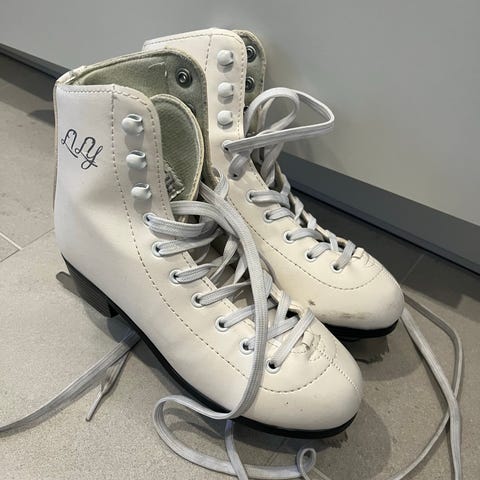 Käytetyt koon 34 luistimet, sisämitta ompelumitalla 22cm. Teroitettu viime talvena, minkä jälkeen luistelu paristi. Toisessa terässä silti ruostetta.