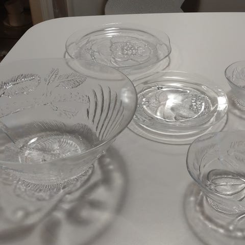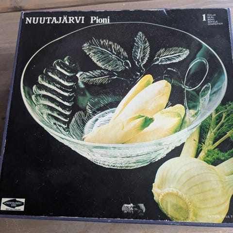 Erityistä: Pioni-sarjan idea on kuvata pionin kukintaa: pienet kulhot/lasit esittävät nuppua, ja lautasissa kukka on täysin auki. Kuvissasi näkyvät siniset tarrat (Nuutajärvi 1793) ovat hyvä merkki – ne kertovat, että astiat ovat vanhempaa tuotantoa ja niitä on todennäköisesti pesty käsin (konepesu irrottaa tarrat helposti).