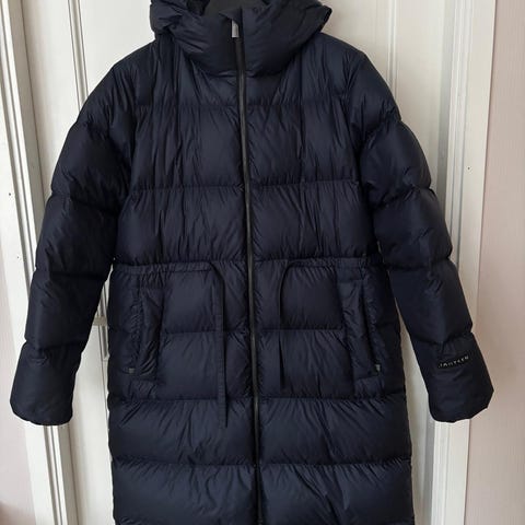 Uusi (laput paikoillaan) Joutsenen musta Silvia untuvatakki. Ostettu viime keväänä Stockmannilta, harmikseni sittenkin liian suuri. Koko M, mutta reilua kokoa.