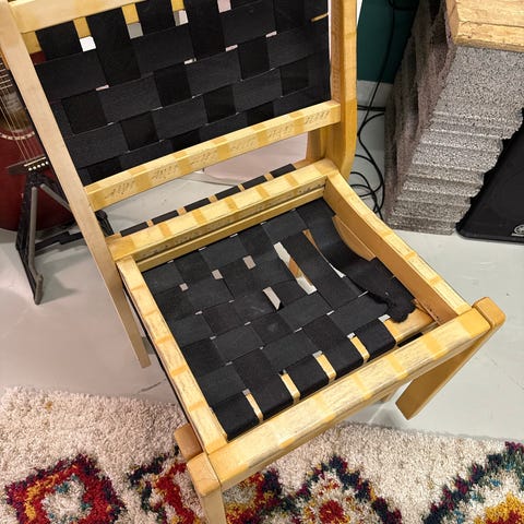 Kunto ok, pientä kulumaa puuosissa. Verhoilu siisti ja hajuton. Selkänojan takana on ruuvikiinnityksellä virsikirjateline ja vaatekoukku, jotka lienee helppo irrottaa.