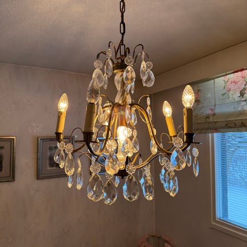 Myydään viisihaarainen valkoinen kattokruunu, jonka loristeet ovat kristallia ja kyyneleet lasia. Varjostimet kuuluvat kauppaan. Hinta 150 euroa.