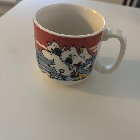 Muumimuki Juhannus, ainoa muki jossa punainen väritys. Viimeinen kotimaassa valmistettu muki, kunnes valmistus meni ulkomaille.