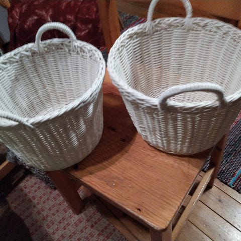 Myydään kaksi koria. Hieman punokset irronneet, mutta siistikuntoisia. Korkeus n 23cm, leveys n 31cm ja pituus n 43cm.
