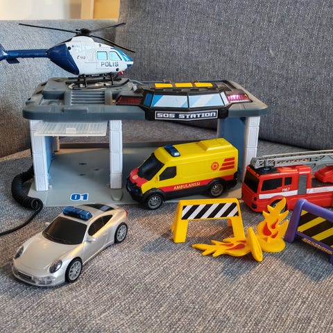 Plus-Plus MINI Basic 480 3in1 Police -rakennussetti. Paloilla voi rakentaa kolme erilaista poliisiajoneuvoa: poliisiauton, helikopterin ja moottoripyörän.