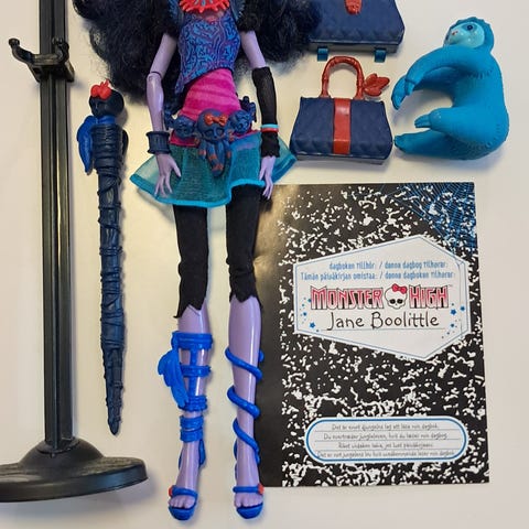 Myydään Monster High Scaremester Twyla Boogeyman. Mukana kuvassa näkyvät tarvikkeet.