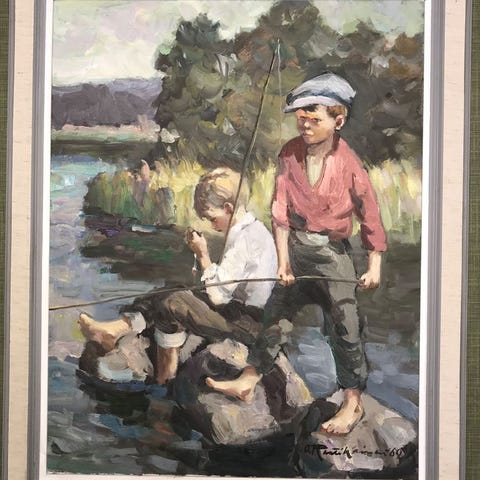 Orvo Raatikainen öljy kankaalle "Onkipojat " vuodelta 1972.